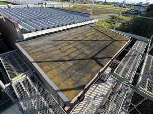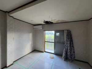 増築部のカラーベスト屋根から水がまわり、室内天井の石膏ボードが落ちてしまっていました。